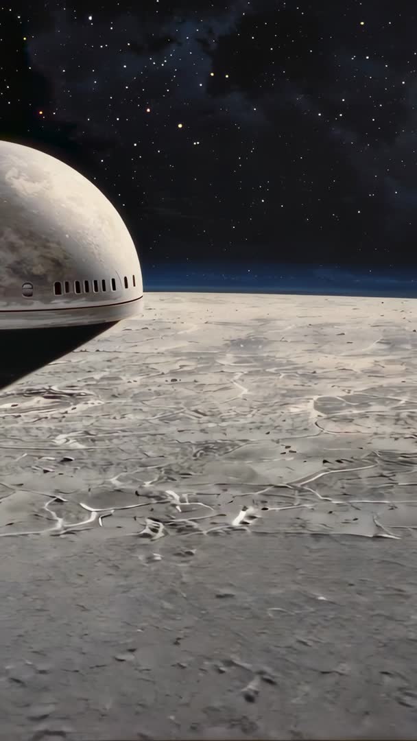 AI Generated Video. Orbiting spacecraft dome occupying left frame, revealing cratered lunar surface and deep starfield above. Panning vertical composition providing generous right-side copy space for titles, logos, or captions. Featuring blue limb along horizon and subtle nebula highlights, creating cinematic cold palette and strong contrast. Suitable for sci-fi trailer background, space exploration promo, mobile ad, social media story, educational clip on lunar geology, or museum exhibit loop. Vertical video format 9:16, high-resolution, loop-friendly timing for seamless playback and easy subtitle placement. Use color grading and typographic overlays to maximize dramatic impact and maintain legibility over shadowed terrain.