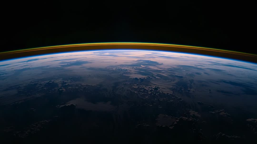 - Orbiting Earth at Dawn Showing Curved Horizon with Colorful Atmospheric Airglow