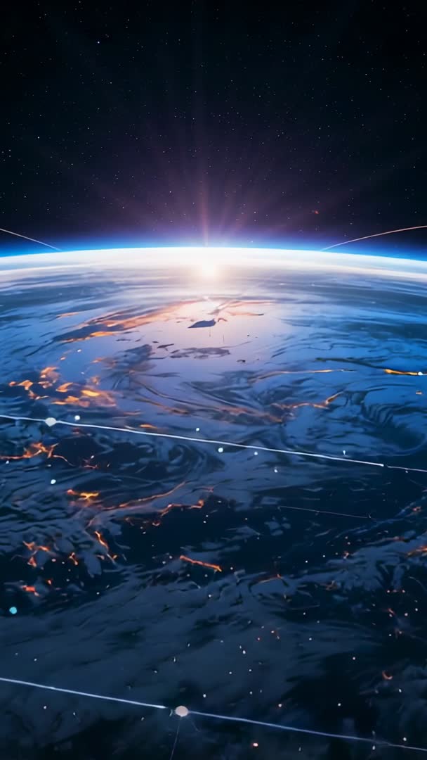 AI Generated Video. Vertical video showing orbiting Earth limb revealing curved horizon at sunrise, sun glinting on ocean surface, atmospheric glow hugging planet edge, dynamic digital grid lines and node points shifting across surface to suggest satellite network and global data flow. Visual style cinematic and futuristic, combining deep space starfield with warm sunrise highlights and cool ocean tones. Usage ideas: suiting technology and telecom promos, enhancing satellite service commercials, complementing space documentaries and science explainers, serving as cinematic opener for mobile campaigns, supporting environmental and ocean monitoring narratives, powering hero screens for apps and websites optimized for vertical formats (9:16), ideal for Instagram Stories, TikTok, Reels, corporate pitch decks and presentation backgrounds.