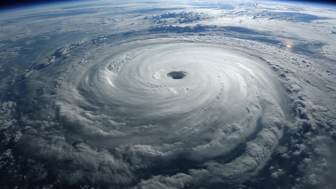 - Orbiting Satellite Capturing Massive Rotating Hurricane with Clear Eye and Sun Glint