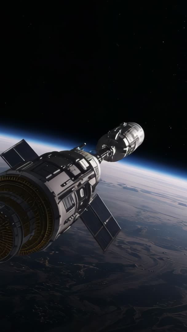 AI Generated Image. Camera circling space module over Earth horizon, revealing deployable solar panels and distant starfield. Module rotating gently while sunlight glinting off metallic surfaces, Earth curvature and thin atmosphere providing dramatic backdrop. Presenting cinematic and futuristic mood with high-contrast blacks and cold metallic highlights, suitable for color grading to teal-orange or desaturated sci-fi look. Serving tech company hero banners, aerospace documentaries, startup pitch videos, sci-fi trailers, social media vertical reels, smartphone backgrounds, educational clips about satellites and orbital mechanics. Including subtle parallax captions, slow zoom, ambient electronic score, lower thirds for data overlays to enhance storytelling. Recommended licensing keywords including space, satellite, spacecraft, orbit, Earth, solar panels, technology, exploration, aerospace, futurism, vertical video.