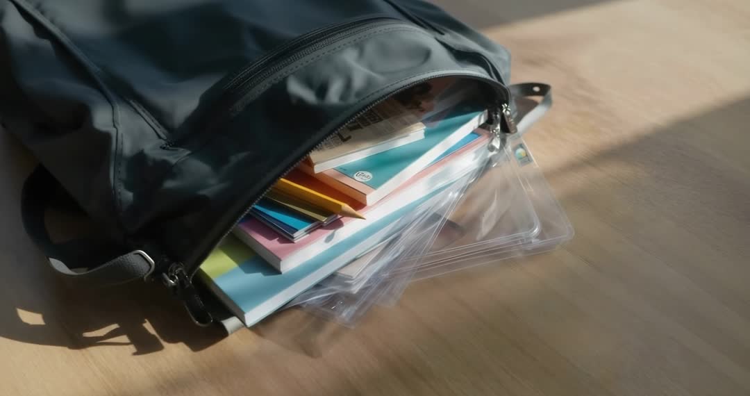 AI Generated Image. Scene featuring partially unzipped black backpack shifting, revealing various school supplies like notebooks, a transparent pencil pouch, and a neatly arranged stack of essentials. Sunlight enhances atmosphere, suggesting focus on organization, planning, or educational setup. Suitable for highlighting simplicity, effective workspace arrangements, and school preparation work showcasing stationary for educational purposes.
