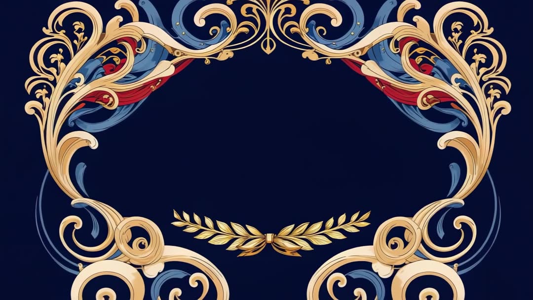 AI Generated Image. AI-generated animation showcasing ornate gold filigree design unfurling and creating an elegant frame on a deep navy background, adorned with a central laurel motif and fleur-de-lis elements. Ideal for luxury branding, formal invitations, or decorative design projects valuing grandeur and refinery. Suit classroom art instruction, animated graphic design presentations, examinations of digital design techniques. Great ebook tool revise decorate materials.