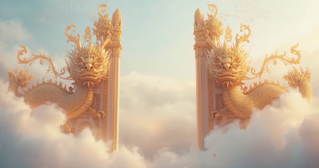 - Ornate Golden Dragon Pillars Amidst Serene Cloudscape