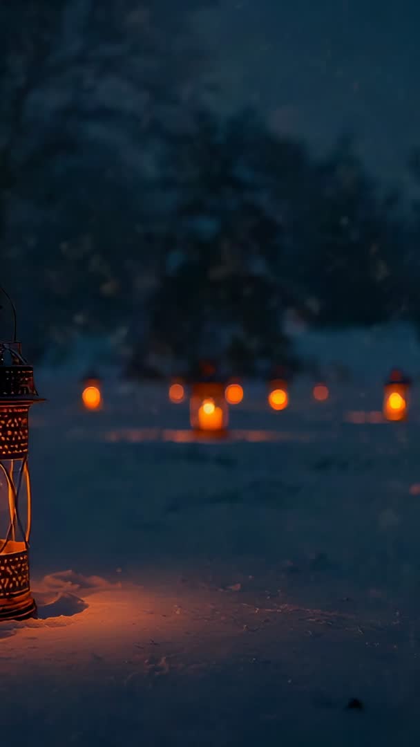 - Ornate lantern flickering on snow with glowing candle trail and warm bokeh — vertical video