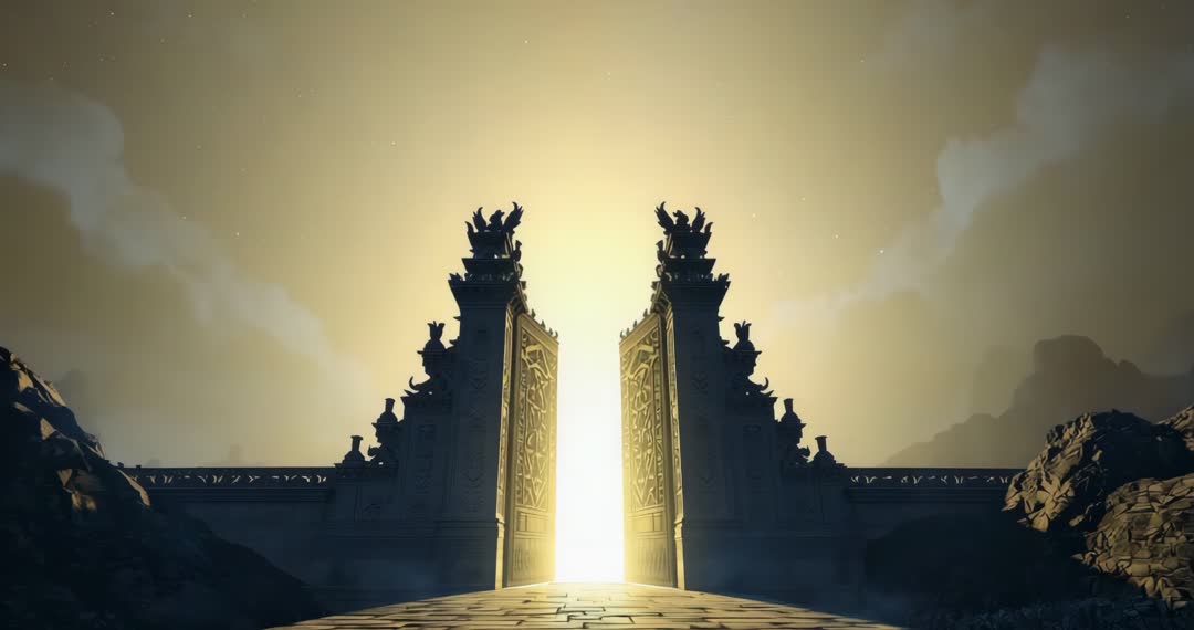 - Ornate Mystic Gates Opening at Illuminated Dawn Fantasy Scene