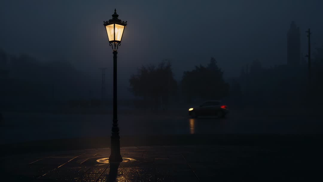 AI Generated Image. Nighttime video focusing on ornate lamppost casting warm amber glow over rain-slick plaza, creating long reflections on wet pavement while car headlights passing through heavy fog in background. Composition centering on lit lamp pole with ample negative space for text or title overlays. Mood conveying solitude, mystery, cinematic tension, and quiet urban ambience. Ideal for film noir scenes, urban lifestyle sequences, weather forecast segments, transportation or safety campaigns, music video backdrops, website hero banners, advertising for hospitality or nightlife brands, and editorial pieces about city nights. Technical suggestions include slow push-in or gentle pan for building atmosphere, adding soft ambient rain and distant engine sounds, applying teal and orange grading for contrast, and exporting loopable 10-15 second master clip for seamless background use.