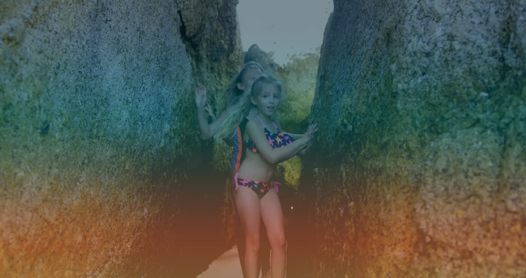 The video depicts two young girls exploring a narrow rocky path during an adventure. Both are in swimwear, suggesting they might be near the beach or a similar destination rich in natural beauty. This scene conveys a sense of exploration, fun, and the enjoyment of travel. Perfect for use in travel brochures, online articles about vacation spots, and content focused on adventure or exploring natural environments.