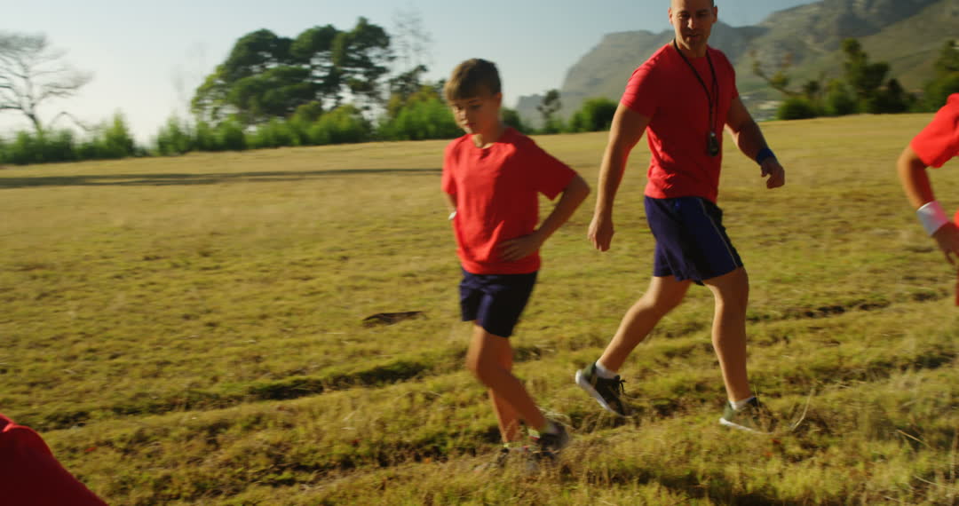 Outdoor activity in nature where children participate in a fitness boot camp led by a trainer. The setting is a sunlit open field, emphasizing health, teamwork, and active lifestyles for young participants. Ideal for content related to children's fitness, health-focused activities, and summer camps.