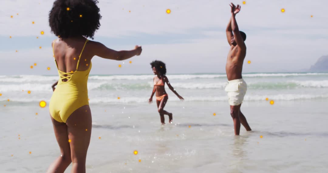 People happily engaging with animated glowing particles in an outdoor beach setting. This concept combines technology with nature, offering immersive and entertaining visual experience. Suitable for promoting tech-driven amusement solutions, interactive effects for events, or vibrant summer destinations.