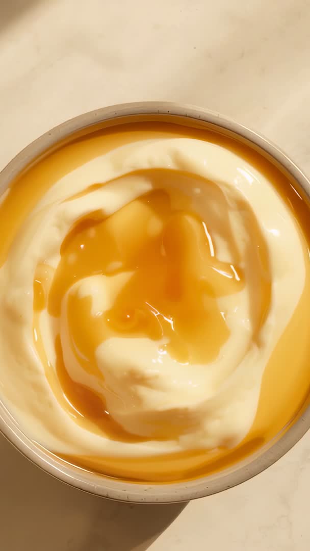 AI Generated Video. Close-up overhead clip showing ceramic cup holding smooth cream, caramel sauce drizzling and settling after pour on marble countertop. Vertical 9:16 format optimized for mobile and social platforms. Perfect for use as background for recipe videos, social media reels, cafe menus, product ads, food blog headers, and digital packaging. Suggest looping short segment for Instagram Reels and TikTok, adding gentle slow zoom, warm color grading, and subtle vignette to emphasize velvety texture. Recommend overlaying short headline and minimalist typography for hero banners or recipe intros, and pairing with ambient music or ASMR stirring sound for immersive content. Useful for showcasing dessert recipes, yogurt toppings, breakfast promotions, cafe branding, and food styling tutorials.