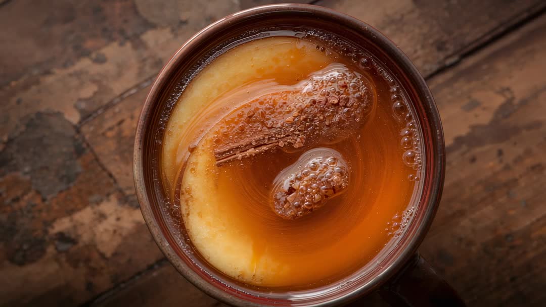 AI Generated Image. Overhead close-up video showing lemon crescent and cinnamon stick floating in amber tea while tiny bubbles gather along cup rim. Warm color palette and rustic wood surface conveying cozy morning or autumn beverage moment. Footage working well for recipe tutorial, cafe menu promo, wellness blog, social media reel, or product advertising for tea brands and artisanal mug makers. Slow motion or subtle pull-focus versions enhancing sensory appeal and emphasizing aroma and texture. Ideal for background b-roll, title screen, hero clip, or packaging visuals for seasonal campaigns.