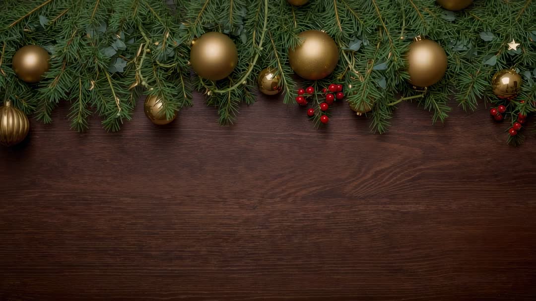 AI Generated Video. Video clip featuring overhead pan across lush pine garland adorned with matte and metallic gold baubles and clusters of red berries over dark wood surface. Composition leaving generous negative space across lower two thirds for text, logos, or product placement. Warm soft lighting creating subtle highlights on ornaments and deep texture in woodgrain. Suitable for holiday greeting motion backgrounds, website hero banners, social media reels, animated card intros, seasonal e-commerce promos, packaging mockups, in-store display loops, editorial openers, DIY craft tutorials. Recommended treatments: slow zoom or gentle parallax to enhance motion, subtle vignette to focus attention, color grade matching gold and evergreen tones, place text or CTA in empty wood area for clear readability.
