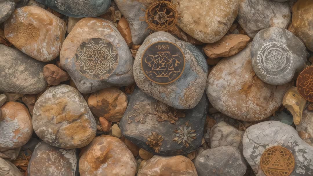 AI Generated Video. Camera pulling overhead and moving in on centered pebble bed revealing circular engraved medallions, star mandalas, and geometric tokens resting among smooth river rocks. Close-up revealing bluish-gray medallion with fine metallic linework surrounded by warm tan stones and weathered textures. Surface details showing cracks, lichen-like patina, and tiny shell fragments for tactile realism. Clip working well for mystical or spiritual themes, ritual or alchemy visuals, mindfulness and meditation content, title sequences and transitions, background loops for websites and social media, and product overlay or packaging mockups. Color palette offering muted blues, cool grays, and warm tans for easy text overlay and branding. High-resolution frames working well for printed textures, editorial spreads, craft and jewelry promotions, and travel or nature segments. Note: clip generated with AI aesthetic, suitable for stylized or abstract projects requiring ornamental stone motifs.