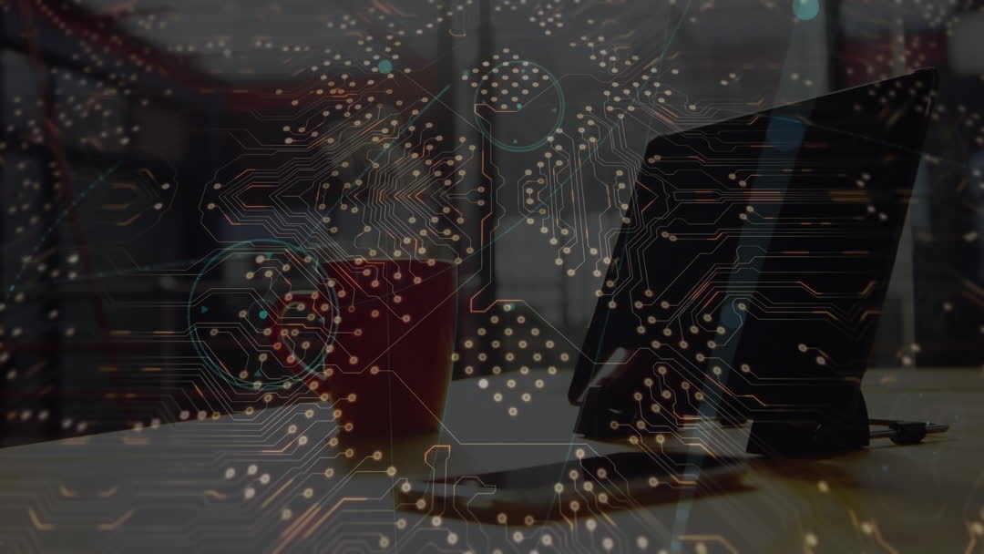 - Overlay of Circuit Board Animation on Devices and Mug on Desk