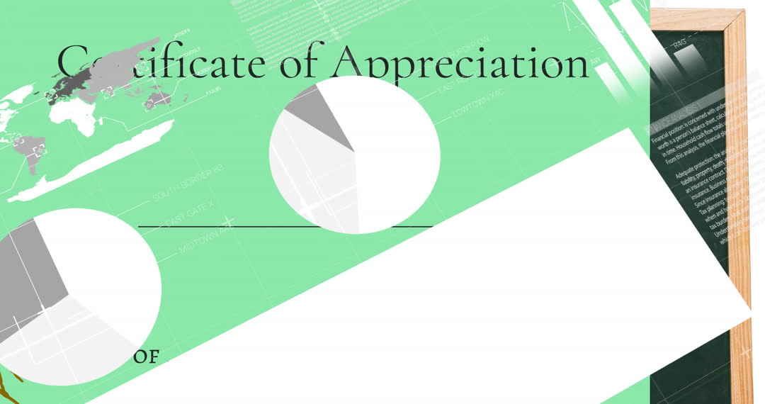 Digital composition features an overlay of analytical data charts and graphs on a certificate of appreciation background. Incorporating elements of data statistics and global map visuals alongside a chalkboard side panel, video creatively combines concepts of analytical success and formal recognition. Ideal for using in corporate presentations, data awards announcements, employee recognition materials, or projects emphasizing data-driven achievements.