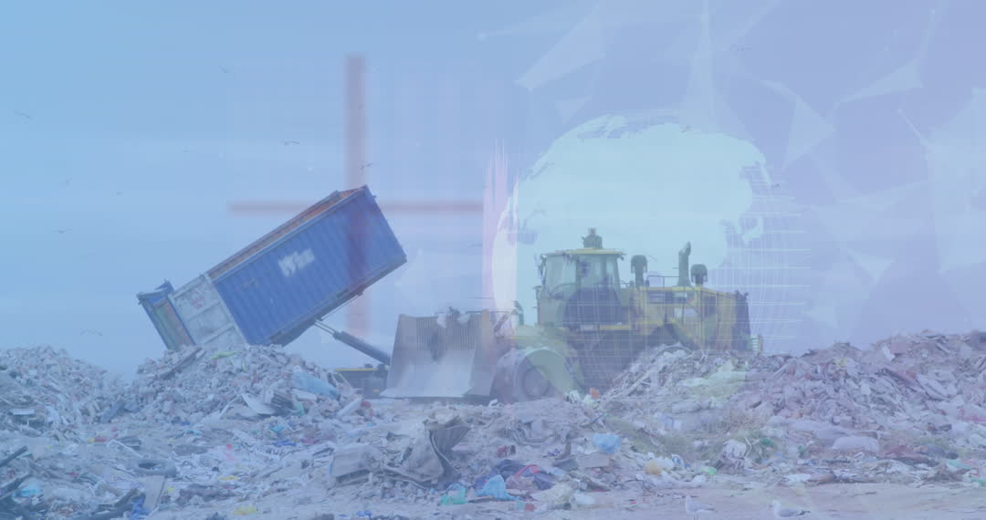 Digital overlay on landfill site showing heavy machinery processing waste, highlighting link between technology and environmental management. Useful for themes in waste management, sustainability innovation, and global ecology discussions.