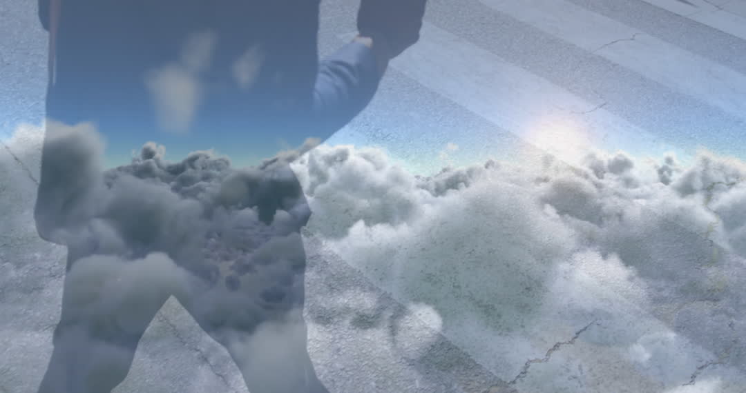 A creative blend shows an African American businessman walking while clouds overlay his video, suggesting themes of aspiration and ambition. The juxtaposition of urban landscape with cloudy sky creates an ethereal effect, hinting at dreams or visions related to business or personal goals. Suitable for concepts involving introspection, travel, business reflections, or mindset illustrations. Ideal for use in business presentations, motivational projects, or creative blog posts.