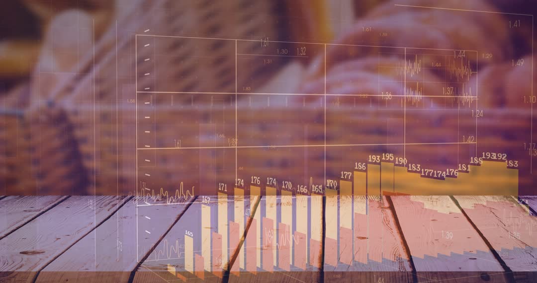 - Overlaying Sales Data Visualization with Rising Bar Chart over Rustic Bakery Tabletop