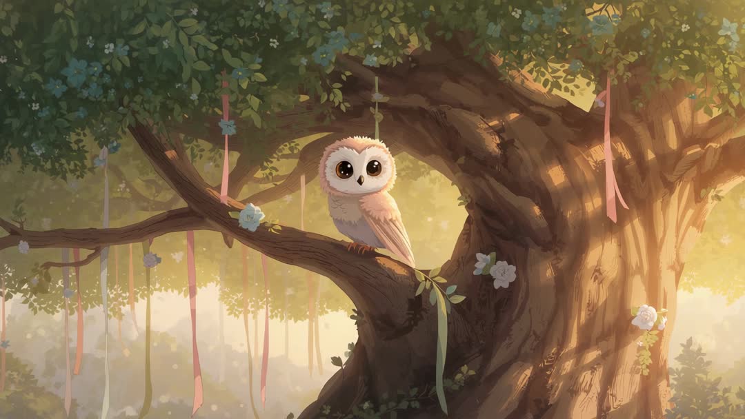 AI Generated Video. Sunlit misty forest scene showing owlet perching on gnarled branch while spreading wings and preparing for flight among hanging ribbons and pale blossoms. Warm golden light filtering through leaf canopy and gentle fog creating magical, tranquil atmosphere. Camera framing favoring close-up of expressive eyes and delicate feather detail with slow parallax movement adding cinematic depth. Color palette leaning toward warm golds, soft greens and pastel ribbon tones for romantic, whimsical mood. Ideas for use: Use as opening sequence for children’s story video, nature documentary intro, wedding invitation animation, relaxation or meditation background, social media short, book trailer, greeting card animation, or brand storytelling for eco-friendly and artisanal products. Loopable clip working well for background ambiance in retail displays, lobby screens, and website hero banners. Pair with light orchestral or ambient soundscape and subtle bird calls to enhance immersion. Recommended deliverables: provide 4K and 1080p versions, produce 10–30 second edits plus longer ambient loops, and offer color-graded and neutral versions for easier compositing.