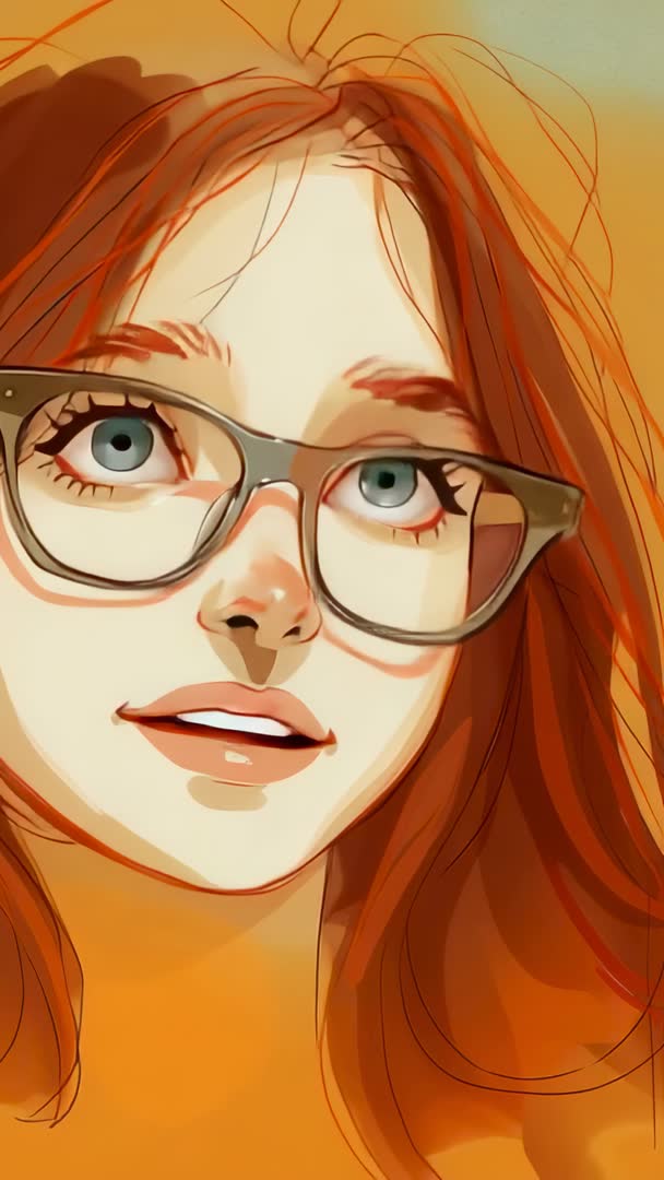 AI Generated Image. Vertical video clip showing painted redhead woman wearing glasses reacting to offscreen cue, starting with soft smile then gasping. Close-up portrait focusing on wide gaze, expressive eyebrows, glossy lips, and subtle glasses reflection under warm orange lighting. Painterly digital painting style combining loose brushwork with smooth shading and vibrant warm palette. Clip working well for social media stories, vertical reels, vlog reaction segments, thumbnail art, editorial about emotion, and advertising for eyewear or beauty. Serving well for app splash screens, channel intros, tutorial thumbnails, mood boards, and art portfolio displays. Offering flexible cropping for portrait orientation and motion-ready export.