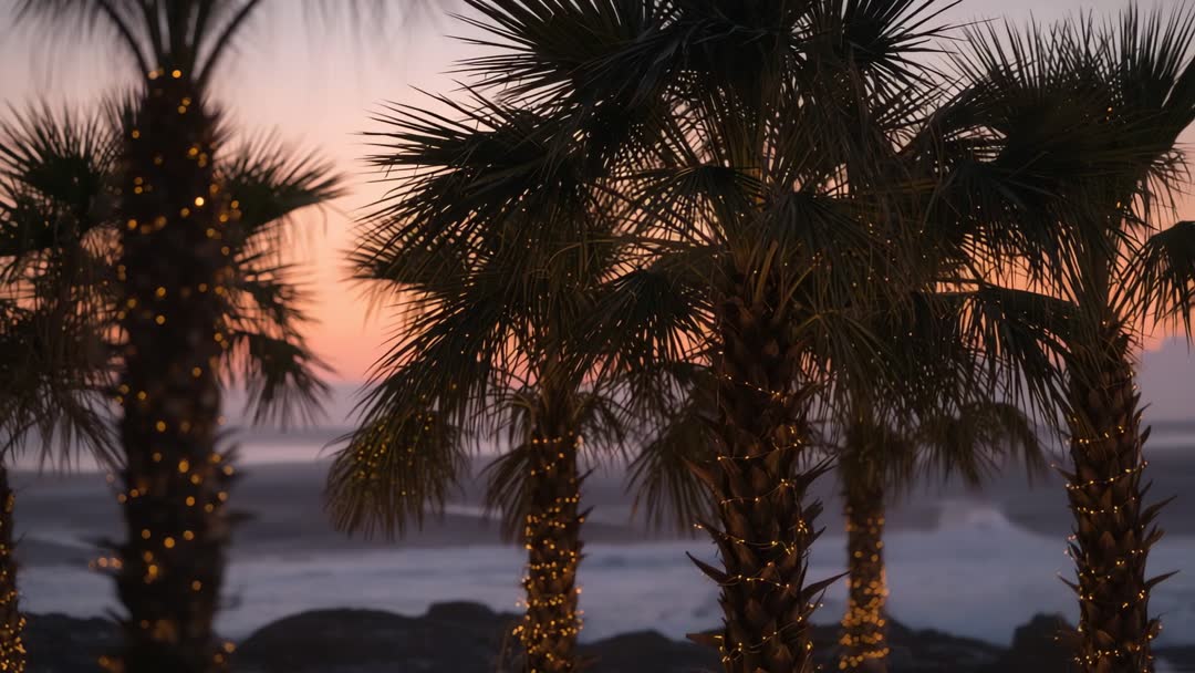 - Palm Trees with Twinkling Lights at Coastal Dusk