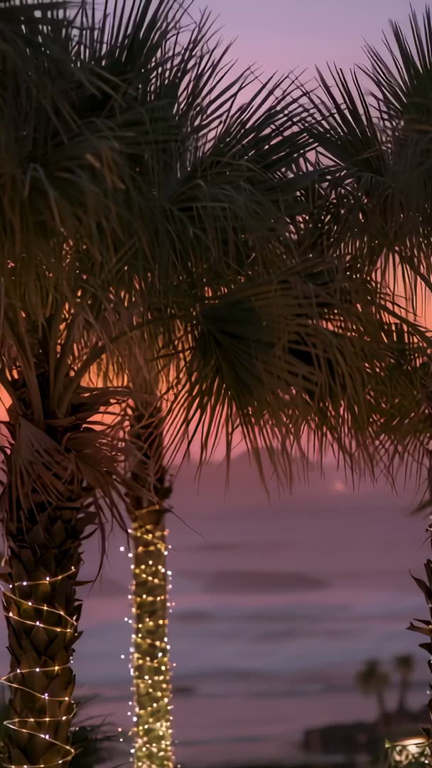 - Palms Swaying at Sunset with Glowing String Lights and Rolling Ocean Waves
