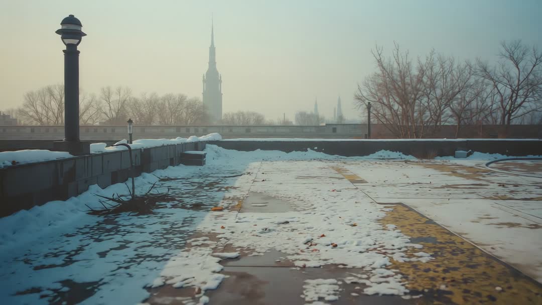 AI Generated Video. This video captures a rooftop panorama featuring a charming vintage lamp post set against an urban skyline with snow patches melting away, revealing yellow markings beneath. Bare trees outline the horizon, crafting a scene steeped in winter atmosphere. Ideal for use in projects requiring urban landscapes, seasonal transitions, or architectural studies. This AI-generated scene reflects minimalist beauty while illustrating elements of city charm in cold months.