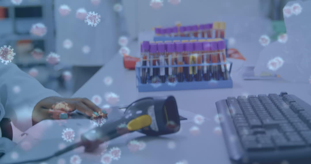 Image shows an African American female scientist working in a laboratory, with animation of virus cells to represent research during a pandemic. This visual is ideal for content related to global health, scientific research, virology, and technological innovation in medicine, showing the frontline efforts and importance of lab work in combating diseases.