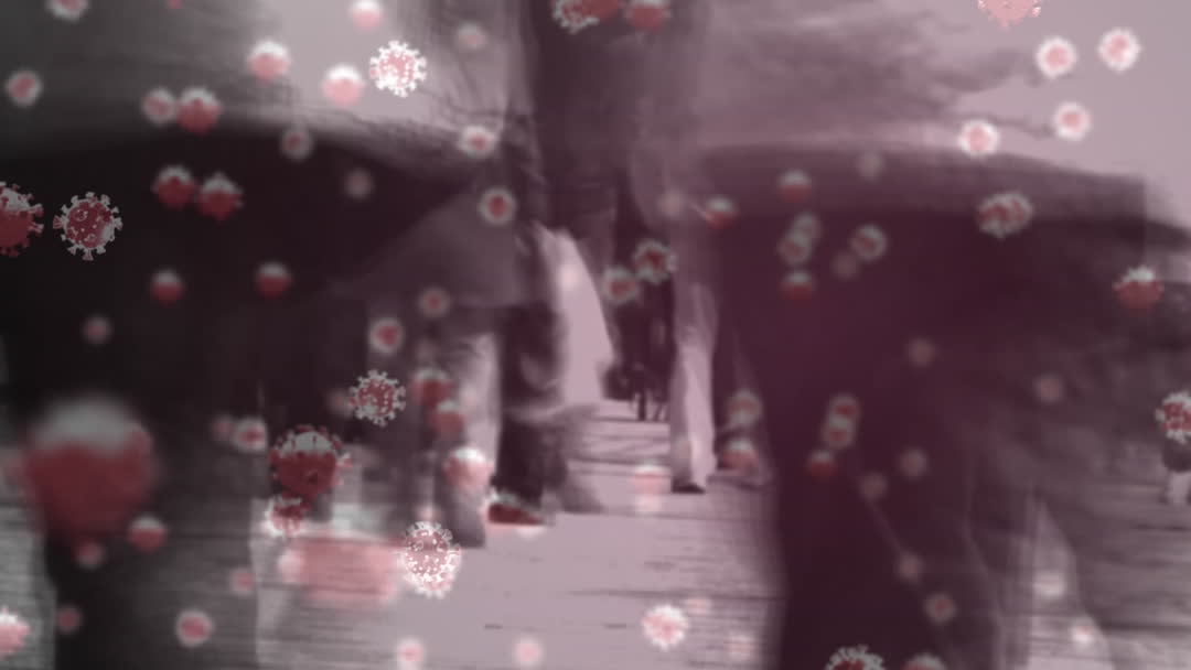 Graphic representation of virus cells floating over a scene of pedestrians walking reflects the impact of the COVID-19 pandemic on urban life. Useful for presentations and media productions focusing on public health challenges, the spread of pandemics, global health awareness, and related sociocultural impacts.