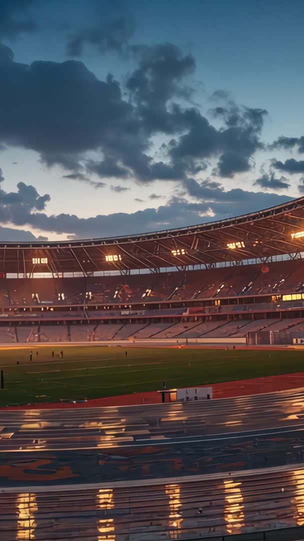AI Generated Image. Showing floodlights turning on while camera panning across empty sports stadium at dusk, with wet running track reflecting warm lights and moody cloud-filled sky. Capturing sweeping grandstand lines and illuminated field for cinematic, atmospheric mood. Working well for broadcast openers, sports promo reels, mobile vertical ads, Instagram Stories, TikTok content, stadium event promos, broadcast transitions, weather segments, and background for score overlays. Suggesting use of slow motion, teal-orange color grade, ambient crowd or cinematic music, and lower-third graphics placed in sky area for titles and logos. Vertical format optimized for mobile viewing and social platforms, providing ample negative space for text and branding. Providing high-impact visual for sports marketing, ticketing campaigns, venue tours, stadium maintenance and safety videos, and editorial coverage. Mood combining quiet pre-event calm with dramatic lighting contrast.