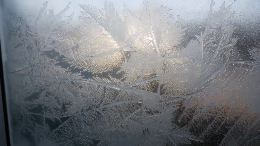 AI Generated Video. Showing delicate fern-like ice patterns forming on interior window pane while camera is panning slowly across frame. Capturing soft warm backlight filtering through translucent crystals and creating subtle contrast between cool blue tones and golden highlights. Offering slow, calming motion ideal for cinematic opener, weather or nature sequence, winter commercial, holiday greeting, or product ad emphasizing warmth and insulation. Working well as background for text overlays, lower thirds, title cards, website hero panels, social media reels, or mood-setting scenes in short films. Providing high-resolution texture useful for graphic overlays, composite layering, and creative transitions.