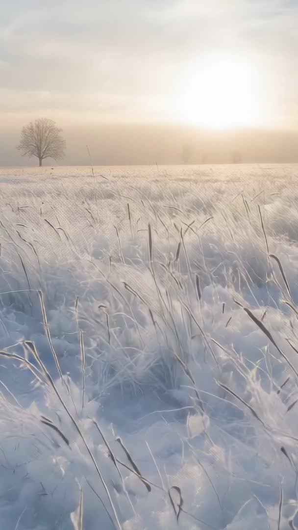 AI Generated Video. Vertical video panning across frost-covered meadow at dawn, showing delicate frosted grasses in foreground and lone tree on left horizon. Soft golden sunrise light filtering through morning mist, creating tranquil ethereal mood and subtle backlight on grass seed heads. Composition offering wide negative space and slow camera movement, ideal for overlaying text, logos, or captions. Use for social media stories, website hero backgrounds, relaxation or meditation clips, seasonal adverts, or broadcast openers. Suitable for nature documentaries, travel films, wellness apps, and editorial pieces about winter, solitude, or rural life. Deliverable as vertical 9:16 clip for mobile-first platforms and looping ambient background for calming sequences.