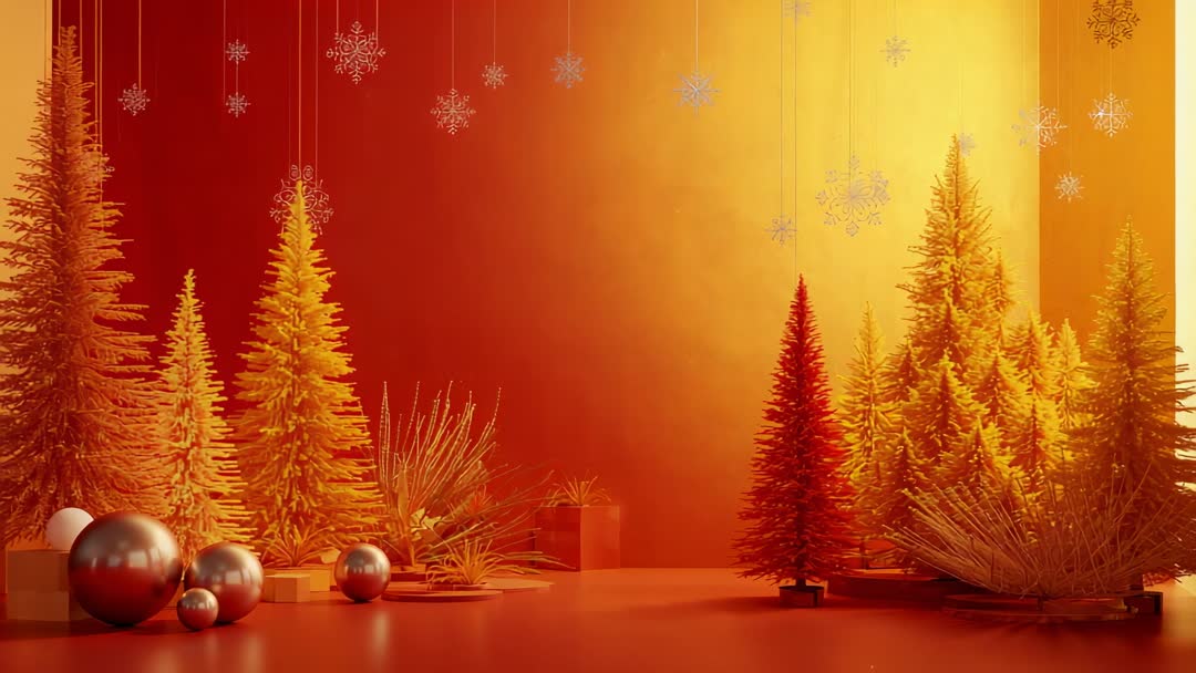 AI Generated Video. This scene depicts a luxurious display of wireframe, golden-toned Christmas trees and metallic ornaments on a rich red surface with a soft yellow to red gradient in the backdrop. Ideal for holiday marketing, invitation templates, season’s greetings, and festive season advertising visuals. The focus on elegance and warmth makes this perfect for high-end seasonal marketing campaigns and digital designs.