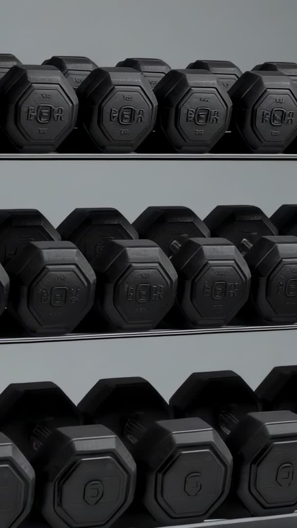 AI Generated Image. Vertical video panning across three-tier rack of hex rubber dumbbells, showing raised embossed weight numbers on each end. Clean neutral background and chrome shelving creating minimalist industrial look. Tight framing highlighting texture, shape, and labeling for clear weight identification. Ideal for fitness marketing, gym equipment catalog, workout app interface, social media reels, and website hero banners. Useful for instructional clips teaching weight selection, membership promotion videos, gym tour montages, and e-commerce product listings. Easy editing for loopable clips, speed ramps, and soundtrack overlays. Landscape and mobile friendly formats suitable for multi-platform use.