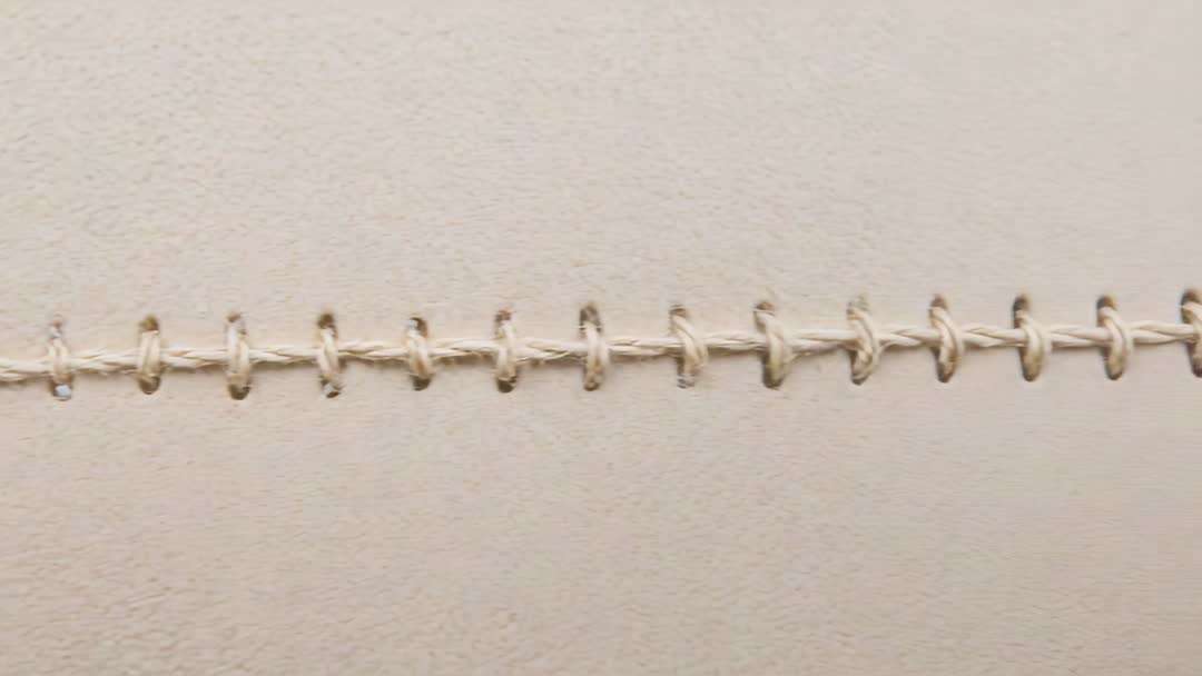 - Panning across horizontal beige leather seam revealing looped stitching macro texture