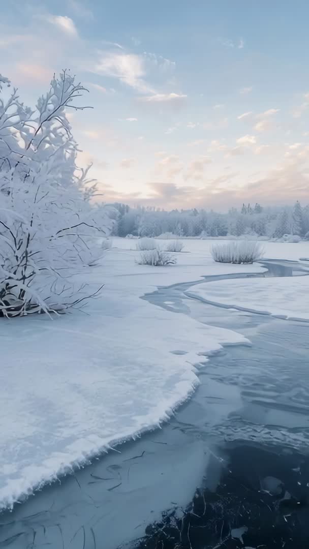 AI Generated Image. Vertical video panning across partly frozen stream, showing snowbanks, frosted bush at left, winding ice channels, and distant frost-covered forest under pastel sunrise sky. Gentle camera movement creating cinematic, immersive feel suitable for use as background clip for social media stories, mobile hero banners, vertical video ads, and short-form content. Footage working well for winter tourism promos, nature documentaries, seasonal greeting visuals, environmental awareness messaging, and relaxation or meditation scenes. Color palette offering soft blues and warm dawn pinks for use in branding, website headers, blog headers, or cold-weather product advertising. Delivering high-resolution vertical composition for editors seeking moody, peaceful winter sequences and seamless loop potential for digital displays and mobile-first video projects.