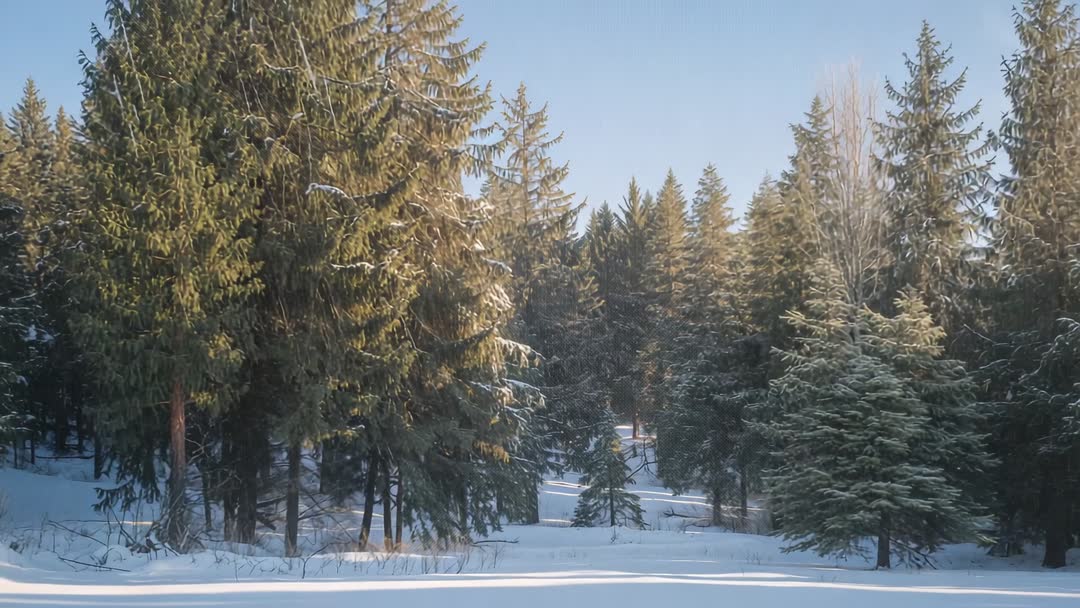 AI Generated Video. Clip showing slow panning movement across sunlit snowy forest, revealing dense fir and spruce tree line edging snow-covered clearing. Soft morning light creating long blue shadows and warm highlights on evergreen branches, producing calm cinematic mood. Shot offering wide horizontal composition and gentle depth for seamless text or title placement. Use for website hero backgrounds, video openers, social media reels, seasonal promotions, travel commercials, documentary sequences, and meditation or wellness clips. Ideal for environmental storytelling, forestry content, holiday campaigns, and outdoor adventure features. High contrast between cool snow and warm sunlight facilitating color grading, layering with ambient sound or music, and looping for subtle background motion.