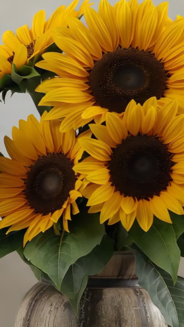 AI Generated Image. Showing slow panning movement across vibrant yellow sunflower bouquet in ceramic vase on rustic tabletop. Close-up framing highlighting rich brown centers, layered petals, and oversized green leaves. Vertical video format optimized for social media stories and reels, web banners, and mobile backgrounds. Suitable for florist marketing, seasonal content, home decor blogs, greeting card animations, and lifestyle commercials. Suggestions for post-production include looping seamless 8-12 second segment, adding soft ambient music, applying warm color grade, and inserting minimal overlay text or logo into upper third. Delivering bright, natural, cheerful mood and rustic handcrafted aesthetic.