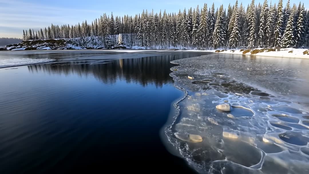 AI Generated Video. Video showcases a serene winter landscape, panning across a calm shoreline with unique bubbly ice formations and snow-covered trees in the background. The tranquil scene captures the serenity of a winter day, ideal for travel videos, nature documentaries, or seasonal visuals.