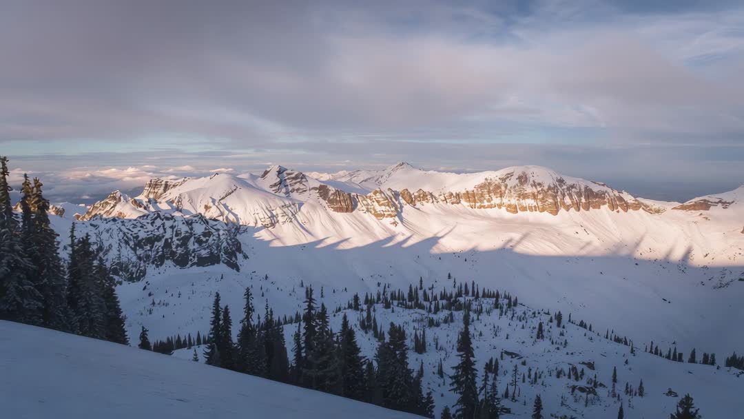 AI Generated Video. Panning aerial footage showing low sun shifting across snow-covered alpine ridge and basin, revealing sunlit peaks and elongated blue shadows. Wide panoramic framing and gentle camera movement creating cinematic opening shot for nature documentary or travel promo. Warm golden highlights contrasting with cool winter shadows, evoking serene and dramatic mood. Footage suiting use in ski resort marketing, outdoor gear advertising, website hero banners, social media reels, broadcast openers, or environmental storytelling. Editing suggestions: color grading for enhanced warm highlights and deep cool shadows, slow speed ramping, gentle stabilization, and soft ambient wind or piano track for immersive atmosphere.