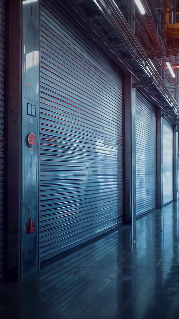 AI Generated Image. Panning along closed metal rollup shutters inside industrial loading bay, camera capturing control column with emergency stop and access buttons. Reflective polished floor and strong leading lines creating modern industrial aesthetic with cool blue tones. Overhead pipes and linear lighting adding depth and texture. Footage working well for warehouse automation, logistics marketing, facility safety training, equipment operation tutorials, and background for corporate technology or architecture projects. Ideal for mobile vertical ads, social media stories, website hero banners, broadcast lower thirds, and scene transitions. Editable for color grading, text overlay, and motion graphics.