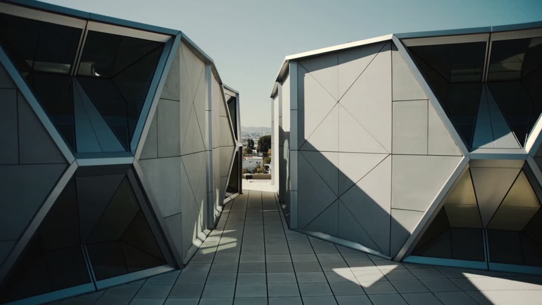 AI Generated Image. Video captures unique angles of geometric building facades as camera moves along tiled walkway in urban area. Modern architectural design showcasing intriguing metal structure and sharp lines. Perfect for illustrating concepts related to futuristic architecture, urban development, or innovative construction design.