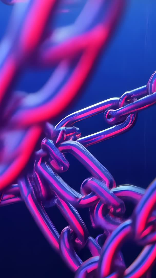 AI Generated Image. Camera panning and tilting, refocusing on glossy neon pink-blue chains under studio lighting. Offering close-up study of interlocked metal links showing vivid reflections and smooth textures. Serving as modern abstract loop for music visuals, tech adverts, social media vertical reels, app splash screens, UI headers, or gallery background. Working with cyberpunk, futuristic, industrial themes and neon color palettes. Recommending looping for ambient motion and syncing to audio beats for rhythmic impact. Suggesting overlaying bold typography or logo for short-form promotional content and using subtle vignette or grain for cinematic feel. Supplied in vertical format optimized for mobile story and reel platforms.