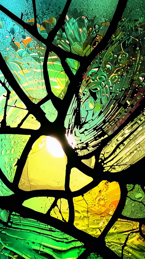 AI Generated Video. Vertical video showing sun appearing through leaded glass while camera panning across embossed textured panels. Footage featuring backlit translucent glass, vivid green and amber highlights, pronounced lead came silhouettes, and sun flare creating luminous burst. Close-up perspective revealing micro textures, bubbles, layered pigments and rippled surfaces for tactile visual interest. Suitable for title backgrounds, social vertical stories, music video overlays, meditation and wellness visuals, architectural B-roll, heritage restoration promos and gallery projection. Production notes: footage working well for slow-motion edits, cross dissolve transitions, loopable background clips, color grading overlays and ambient soundscapes. Licensing ideas: use in broadcast title package, documentary interior sequence, mobile vertical ad, social media reel, product showcase backdrop or fine art installation.