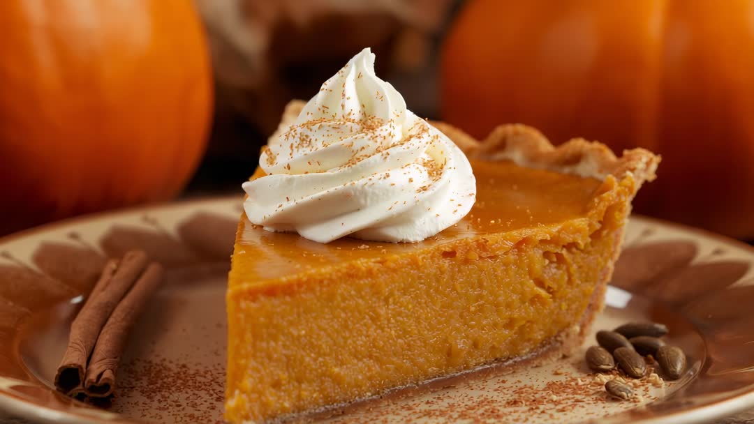 AI Generated Image. Video showing slow panning and closing on slice of pumpkin pie topped with whipped cream swirl and light cinnamon dusting. Composition featuring cinnamon sticks and pumpkin seeds on plate, background pumpkins out of focus, warm autumn tones and shallow depth of field creating cozy mood. Footage working well for Thanksgiving recipe tutorials, seasonal social media reels, restaurant menu promos, baking channel intros, holiday advertising, packaging mockups, blog headers, and cookbook content. Clip allowing editors to cut in title cards, overlay text, or step-by-step recipe instructions while maintaining appetizing close-up details. Color palette matching fall campaigns and lifestyle branding, ideal for creating warm, inviting seasonal messages.