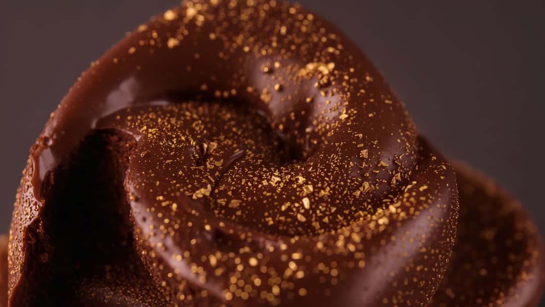 AI Generated Image. Revealing dark chocolate ganache spiral dusted with edible gold flakes, filmed with slow panning camera to emphasize glossy surface and intricate texture. Showing macro close-up of swirl movement and delicate metallic sparkle for strong sensory appeal. Suited for gourmet food commercials, dessert menu displays, luxury confectionery branding, social media reels, recipe videos, and cooking show b-roll. Useful for packaging hero clips, website banners, in-store digital signage, and promotional ads highlighting premium chocolate. Compatible with looping sequences and slow motion cutaways for cinematic edits; suggesting warm color grading to enhance richness and subtle ambient soundtrack for upscale mood.
