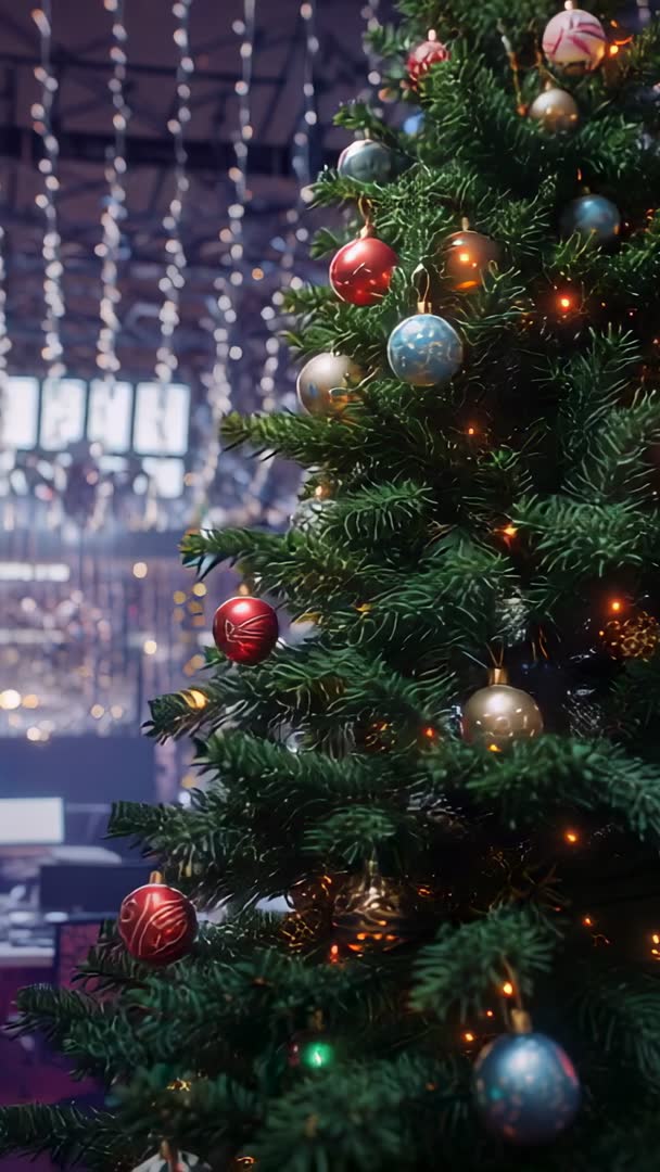 AI Generated Video. Vertical video showcasing close-up pan over decorated Christmas tree with glowing baubles and warm fairy lights in cozy cafe interior. Soft bokeh background creating festive, intimate mood, suiting holiday marketing and social content. Suiting Instagram Reels, TikTok ads, store signage, restaurant holiday promotions, website hero banners, seasonal event invites, looped backgrounds for digital displays. Crop-friendly for mobile formats, maintaining tree detail while preserving blurred highlights for text overlays. Color palette featuring deep greens, red, gold, blue ornaments creating elegant, classic holiday look. Encouraging slow-motion edits, gentle pans, ambient montage sequences for atmospheric commercials. Licensing suggestions: hospitality brand promotions, retail campaign spots, seasonal social posts, editorial features on festive interiors.
