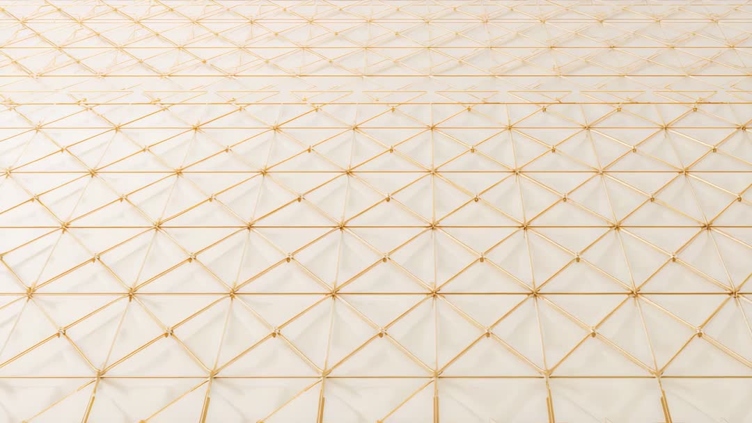 AI Generated Image. Showing cream-colored quilted membrane canopy stretched across hall with gold nodes and tension cables forming repeating triangular tessellation. Camera panning slowly across surface, revealing rhythmic geometry, soft shadows, and subtle depth. Composition highlighting large-scale architectural pattern, minimal color palette, and metallic accents. Suiting use in architectural presentations, interior design reels, product background for luxury brands, motion graphics loops, website hero banners, or editorial on parametric fabrication. Editing ideas: looping seamless pan, close-up cuts on node details, slow zoom out for cinematic reveal, color grading toward warmer gold tones for premium feel. Delivering modern, abstract backdrop for titles, overlays, corporate identity videos, and social media shorts. Providing high-resolution, wide-shot aesthetic for print layouts, brochures, and exhibition signage.
