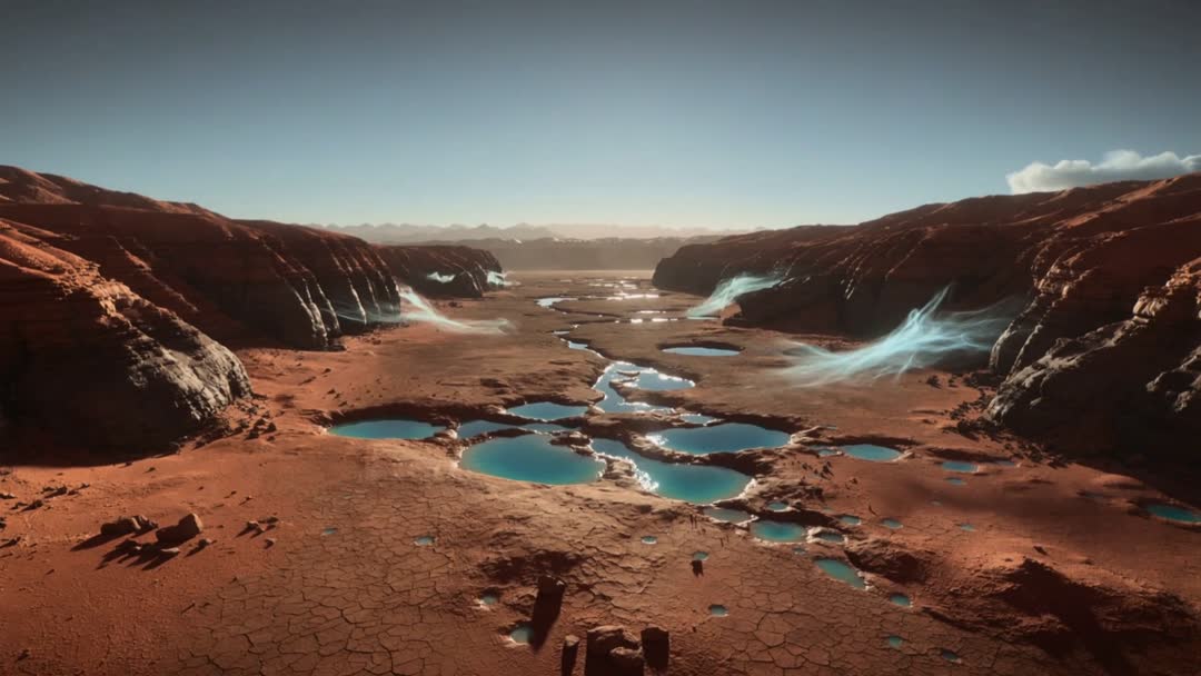AI Generated Image. Camera panning across cracked red plain, revealing chain of turquoise pools nestled between steep cliffs, mist drifting from water surfaces as daylight cools. Composition combining wide aerial view and cinematic lighting, highlighting contrast between arid terrain and vibrant water. Mood evoking otherworldly exploration, solitude and vastness of landscape. Suiting sci-fi film backgrounds, game environment assets, concept trailers. Suiting travel and adventure campaigns promoting remote canyon exploration. Suiting editorial on climate change, desert hydrology and water scarcity. Suiting website hero banners, social media reels, documentary promos and book covers. Color grading suggestions: emphasizing warm red tones with cool turquoise highlights and soft backlighting to enhance dramatic contrast. Allowing slow pan or subtle zoom to accentuate pool reflections and mist movement.